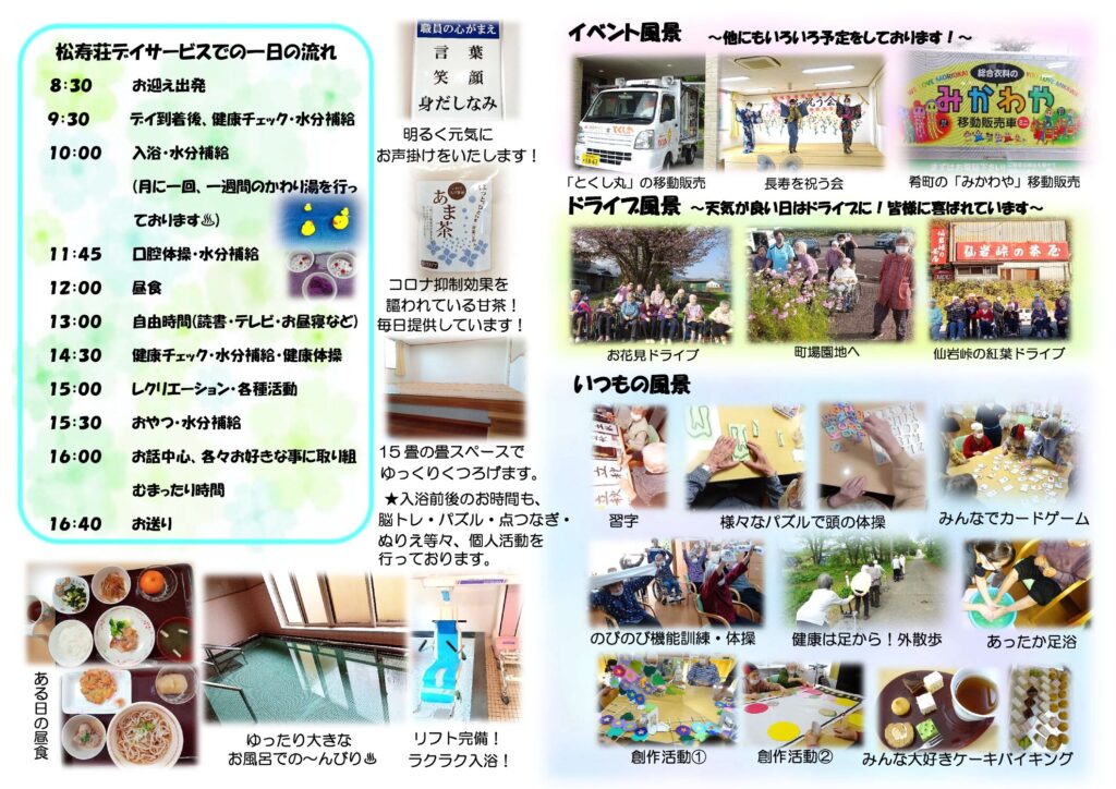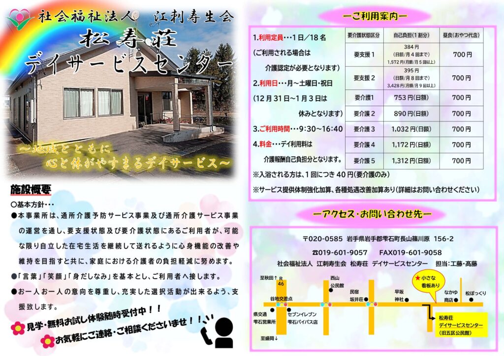 一覧江刺寿生会法人ヒロノエリア伊手エリア反町エリア雫石エリアヒロノ障がいエリア 2026年03月23日雫石エリア 松寿荘デイサービスセンター パンフレット 雫石エリア 松寿荘デイサービスセンターです。 毎月のイベントや季節のドライブ🌸、ゆったりとした入浴♨、様々な個人活動✐などを行って おります。見学をご希望の方、詳しくお話を聞いてみたいという方はぜひご連絡ください♪ < 前の記事へ