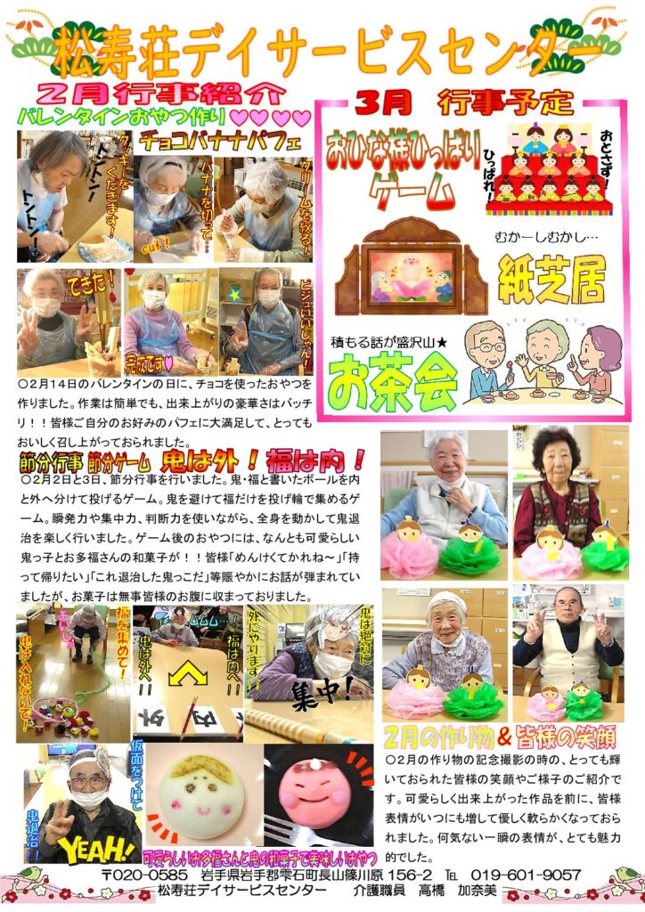 一覧江刺寿生会法人ヒロノエリア伊手エリア反町エリア雫石エリアヒロノ障がいエリア 2026年03月23日雫石エリア 松寿荘デイサービスセンター ミニ広報3月号 雫石エリア 松寿荘デイサービスセンターです。 2月に行った活動の様子や、3月の行事予定を載せています。 見学ご希望の方、詳しくお話を聞いてみたい方はぜひ当デイサービスまでご連絡ください♪ (TEL 019-601-9057 担当:管理者 工藤) < 前の記事へ 次の記事へ >